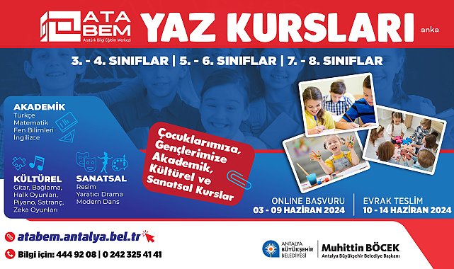 (ANTALYA) - Antalya Büyükşehir Belediyesi Atatürk Kültür ve Bilgi Eğitim Merkezi (ATABEM) yaz dönemi kurs kayıtları, 3 Haziran Pazartesi günü başlıyor. Öğrenciler, 9 Haziran’a kadar istediği kurslara çevrim içi kayıt yaptırarak, yaz tatilinde hem eğlenmenin hem de öğrenmenin keyfini çıkaracak. Sosyal Hizmetler Dairesi Başkanlığı Yaygın Eğitim Şube Müdürlüğü’ne bağlı ATABEM’de öğrencilere yönelik ücretsiz yaz kursları düzenleniyor. Öğrenciler, kurslar için 3-9 Haziran 2024 tarihleri arasında ‘atabem.antalya.bel.tr’ adresinden çevrim içi işlemler üzerinden kayıtlarını yapılabilecek.3, 4, 5, 6, 7. ve 8. sınıf öğrencileri, yoğun ve yorucu geçen okul döneminden sonra yaz kursları ile ATABEM’de hem eğlenmenin hem de öğrenmenin keyfini çıkaracak. Akademik, kültürel ve sanatsal alanlardan oluşan ücretsiz yaz kursları, 20 kurs merkezinde 1 Temmuz Pazartesi günü başlayacak.Öğrenciler; Türkçe, matematik, fen bilimleri ve İngilizce, bağlama, gitar, Türk halk oyunları, piyano, satranç, yaratıcı drama, modern dans ve zeka oyunları (mangala) gibi branşlarda ATABEM kurs merkezlerinde eğitim alacak.