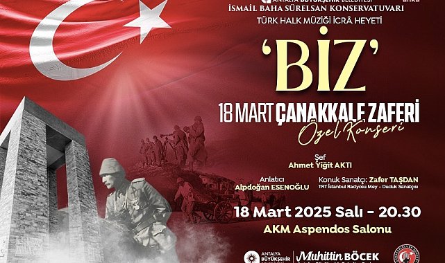 (ANTALYA) - Antalya Büyükşehir Belediyesi, Çanakkale Zaferi’nin 110’uncu yıl dönümü dolayısıyla 18 Mart Salı günü saat 20.30’da “Çanakkale Zaferi Özel Konseri” düzenleyecek. Antalya Büyükşehir Belediyesi İsmail Baha Sürelsan Konservatuvarı Türk Halk Müziği İcrâ Heyeti, Çanakkale Deniz Zaferi'nin 110’uncu yıl dönümü ve Şehitleri Anma Günü’nde anlamlı bir konser düzenliyor. Şef Yiğit Aktı yönetiminde gerçekleşecek “Biz” adlı özel program, 18 Mart Salı günü saat 20.30’da Atatürk Kültür Merkezi Aspendos Salonu’nda izleyiciyle buluşacak. TRT İstanbul Radyosu Mey-Duduk sanatçısı Zafer Taşdan’ın konuk olarak katılacağı konser programı, Alpdoğan Esenoğlu’nun anlatımıyla gerçekleşecek.