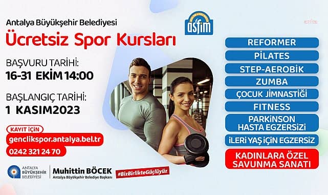 Antalya Büyükşehir Belediyesi’nin ücretsiz spor imkanı sunduğu Antalya Spor ve Fitness Merkezleri’nde (ASFİM) yeni dönem kurs kayıtları başladı. Kurslar için 31 Ekim’e kadar online kayıt yapılacak, dersler ise 1 Kasım’da başlayacak.Antalya Büyükşehir Belediyesi Gençlik ve Spor Hizmetleri Dairesi Başkanlığı bünyesinde hizmet veren ASFİM, vatandaşları sağlıklı ve hareketli yaşamla buluşturmaya devam ediyor. ASFİM’in ücretsiz spor hizmetinden faydalanmak isteyen vatandaşların yeni dönem kayıtları için 16 -31 Ekim günleri arasında internet adresinden başvuru yapmaları gerekiyor.REFORMER, PİLATES VE FİTNESS ASFİM kursları 1 Kasım’da başlayacak. Profesyonel eğitmenler eşliğinde ücretsiz spor yapma imkânı sunan ASFİM’lerde vatandaşlar için fitness, step-aerobik, pilates, wellness reformer, zumba, çocuklar için temel cimnastik dersleri ve parkinson hastaları için de egzersiz kursları verilecek.İLERİ YAŞ İÇİN EGZERSİZ KURSU ASFİM’de ayrıca ’ileri yaş için egzersiz’ kursu ile 60 yaş üstü vatandaşlar için özel çalışma programıyla formda kalmalarını sağlayacak. ASFİM yaz kurslarında kadınlara özel savunma sanatı eğitimi de verilecek. ASFİM’in kurslarından ücretsiz faydalanmak isteyen vatandaşlar, 31 Ekim’e kadar 'www.genclikspor.antalya.bel.tr' adresinden online olarak başvuru yapabilecek.