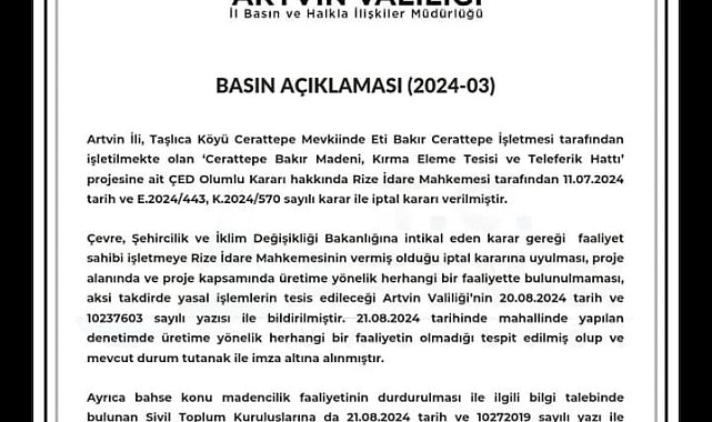 UĞUR İSTANBULLU(ARTVİN)- Cengiz Holding'in işlettiği Cerattepe Bakır Madeni tesisine yönelik Çevresel Etki Değerlendirme (ÇED) olumlu kararı, Rize İdare Mahkemesi tarafından iptal edilmesinden ardından Artvin Valiliği açıklama yaptı. Valilik, ilgili firmayı uyararak, karara uyulmaması durumunda yasal işlemlerin başlatılacağını bildirdi.Artvin Valiliği'nin resmi X hesabından yaptığı açıklamada, tesisin ''ÇED olumlu kararının iptal edildiği'' hatırlatılarak, şu ifadelere yer verildi:''Artvin İli, Taşlıca Köyü Cerattepe Mevkiinde Eti Bakır Cerattepe İşletmesi tarafından işletilmekte olan 'Cerattepe Bakır Madeni, Kırma Eleme Tesisi ve Teleferik Hattı' projesine ait ÇED Olumlu Kararı hakkında Rize İdare Mahkemesi tarafından 11.07.2024 tarih ve E.2024/443, Κ.2024/570 sayılı karar ile iptal kararı verilmiştir.Çevre, Şehircilik ve İklim Değişikliği Bakanlığına intikal eden karar gereği; faaliyet sahibi işletmeye Rize İdare Mahkemesinin vermiş olduğu iptal kararına uyulması, proje alanında ve proje kapsamında üretime yönelik herhangi bir faaliyette bulunulmaması, aksi takdirde yasal işlemlerin tesis edileceği Artvin Valiliği'nin 20.08.2024 tarih ve 10237603 sayılı yazısı ile bildirilmiştir. 21.08.2024 tarihinde mahallinde yapılan denetimde üretime yönelik herhangi bir faaliyetin olmadığı tespit edilmiş olup ve mevcut durum tutanak ile imza altına alınmıştır.Ayrıca bahse konu madencilik faaliyetinin durdurulması ile ilgili bilgi talebinde bulunan Sivil Toplum Kuruluşlarına da 21.08.2024 tarih ve 10272019 sayılı yazı ile faaliyetin durdurulduğuna dair bilgi verilmiştir.''