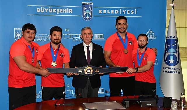 Sırbistan’ın başkenti Belgrad’da düzenlenen 2023 Dünya Güreş Şampiyonası'ndan 4 madalya ve 5 olimpiyat kotası alarak dönen milli güreşçiler Rıza Kayaalp, Taha Akgül, Ali Cengiz ve Enes Başar, Ankara Büyükşehir Belediye Başkanı Mansur Yavaş'ı makamında ziyaret etti.