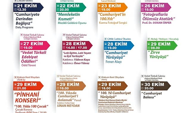 Atakum’da Cumhuriyet’in 100. yıl dönümü, birbirinden özel etkinliklerle kutlanacak. Pinhani konserinden Sinan Meydan’la panel programına ve Cumhuriyet Yürüyüşü’ne kadar vatandaşları dolu dolu bir program bekliyor. Atakum Belediyesi, Cumhuriyet’in ilan edilişinin 100. yıl dönümünde bayram coşkusunu kentin dört bir yanına taşıyor. Kutlama programında Cumhuriyet Yürüyüşü’nden konserlere; söyleşilerden fotoğraf sergisine kadar her kesime ve zevke hitap eden etkinlikler yer alacak.100. YILA ÖZEL ETKİNLİKLERHasan Ali Yücel Gençlik, Bilim ve Sanat Merkezi’nde düzenlenen ‘Cumhuriyet’in 100. Yılı’ konulu karma fotoğraf sergisi, 23 Ekim Pazartesi günü saat 19.00’da sanatseverlerle buluşuyor. 26 Ekim Perşembe günü, saat 19.00’da açılacak Prof. Dr. Osman Ürper’in seçkilerinden oluşan ‘Fotoğraflarla Ölümsüz Atatürk’ sergisi, vatandaşlara tarihten kareler sunacak. ‘3. Vedat Türkali Edebiyat Ödülleri’ni kazanan eser sahipleri; 27 Ekim Cuma günü, Vedat Türkali Salonu’nda düzenlenecek törenle ödüllerini alıyor. 28 Ekim Cumartesi günü Vedat Türkali Salonu’nda saat 14.00’da başlayacak programda ise Eski TBMM Üyesi ve Eğitimci Yıldırım Kaya ile Öğrenci Veli Derneği (Veli-Der) Genel Başkanı Ömer Yılmaz’ın katılımıyla Cumhuriyet’in önemli kazanımlarından ‘Laik Eğitim, Laik Yaşam ve Eşit Yurttaşlık’ üzerine sohbet edilecek. Çiftlik Caddesi’nde saat 19.00’da başlayacak Fener Alayı, bayram coşkusunu kentin dört bir yanına taşıyor.PİNHANİ’DEN CUMHURİYET KONSERİSamsun Dağcılık Kulübü İle organize edilen ‘‘Zirve Yürüyüşü’, 29 Ekim Pazar günü saat 8.00’da başlayacak. Spor tutkunları Akdağ, Nebiyan ve Kocadağ’ı kapsayan alanı Cumhuriyet’in 100. yılı için katedecek. Tarihçi-Yazar Sinan Meydan’la ‘100. Yılında Cumhuriyet’i Anlamak’ başlıklı panel ise Vedat Türkali Salonu’nda vatandaşlarla buluşuyor. Saat 16.00’da başlayacak panelde Cumhuriyet’in kuruluşundan bugüne tarihe yön veren olaylar, masaya yatırılıyor. Cumhuriyet sevdalıları saat 18.00’da Cumhuriyet Kadınları Bandosu eşliğinde başlayacak ‘100. Yıl Cumhuriyet Yürüyüşü’ ile Atakum Belediyesi’nden Atakum Kent Meydanı’na kadar olan mesafeyi marşlar eşliğinde yürüyecek. Araç konvoyu saat 16.00’da Atakum Belediyesi hizmet binası önünden hareket ederek Abdullah Gül Bulvarı güzergahını takip edecek. Vatandaşları, Kent Meydanı’nda ünlü müzik grubu Pinhani’nin konseri bekliyor. Saat 21.00’da başlayacak konserde, Atakum Belediyesi’nin Çocuk Korosu da ‘100. Yılda 100 Çocuk’ sloganıyla sahne alacak. Atatürkçü Düşünce Derneği (ADD) ile düzenlenen geleneksel ‘Cumhuriyet Balosu’, Vedat Türkali Salonu’nda 30 Ekim Pazartesi günü saat 20.00’da başlayacak.