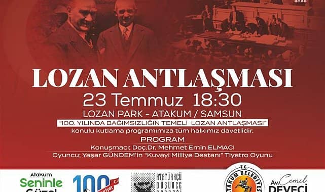 Atakum Belediyesi ve ADD Samsun Şubesi iş birliğinde Lozan Antlaşması’nın 100. yıl dönümü özel bir organizasyonla kutlanacak. Ünlü tarihçi Doç. Dr. Mehmet Emin Elmacı ve usta sanatçı Yaşar Gündem’in katılımıyla gerçekleştirilecek program, Lozan Parkı’nda 23 Temmuz Pazar günü saat 18.30’da başlayacak.