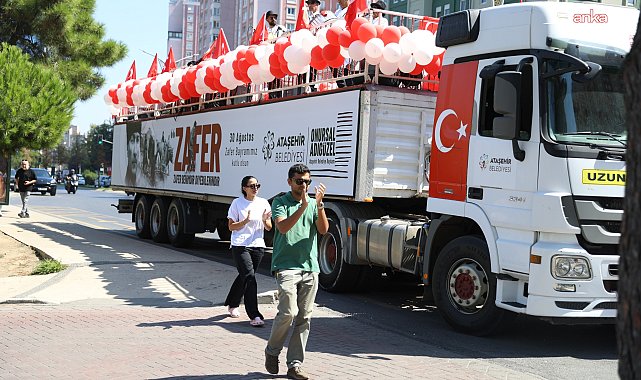 (İSTANBUL) - 30 Ağustos Zafer Bayramı kutlamaları, Ataşehir'de renkli görüntülere sahne oldu. Sabah saatlerinde Atatürk Anıtı’na çelenk sunma töreniyle başlayan kutlamalar, gün boyu Zafer TIR’ının marşlar eşliğinde mahalleleri dolaşmasıyla devam etti. Ataşehirliler, balkonlardan ve meydanlardan alkışlarla eşlik ederek bayram sevincini paylaştı.Ulu Önder Mustafa Kemal Atatürk komutasındaki Türk ordusunun, 30 Ağustos 1922’de zaferle sonuçlandırdığı Büyük Taarruz ve Başkomutanlık Meydan Muharebesi’nin 103. yıl dönümü, Ataşehir’de büyük bir coşkuyla kutlandı.Kutlamalar, sabah saatlerinde Barbaros Mahallesi Cumhuriyet Meydanı’nda düzenlenen çelenk sunma töreniyle başladı. Saat 09.00’da Atatürk Anıtı’na çelenklerin bırakılmasının ardından saygı duruşu ve İstiklal Marşı okundu.Cumhuriyet Meydanı’nda düzenlenen anma töreninde Ataşehir Belediye Başkanı Onursal Adıgüzel, Ataşehir Kaymakamı Bekir Dınkırcı, Garnizon Komutanı Albay Rüstem Yiğit Şengül, CHP İstanbul Milletvekili Ali Gökçek, Atatürk anıtına çelenk koydular.Günün ilerleyen saatlerinde, Ataşehir Belediyesi’nin hazırladığı Zafer TIR’ı, bando eşliğinde ilçe sokaklarını dolaştı. Saat 18.00' kadar mahalleleri gezecek TIR, marşlar ve şarkılarla vatandaşlara bayram coşkusunu yaşattı. Ataşehirliler, balkonlardan ve meydanlardan alkışlarla eşlik ederek 30 Ağustos sevincini hep birlikte paylaştı.Zafer TIR’ı, Ferhatpaşa, Kayışdağı, Mevlana, Atatürk, Barbaros, Küçükbakkalköy, İçerenköy, İnönü, Örnek, Esatpaşa ve Mustafa Kemal mahallelerinde coşkulu anlara sahne oldu.Karikatürlerle Atatürk Sergisi Zafer Bayramı kapsamında Ataşehir Belediyesi, “İstiklalden İnkılaba: Karikatürlerle Atatürk” başlıklı özel bir sergiyi sanatseverlerle buluşturdu.