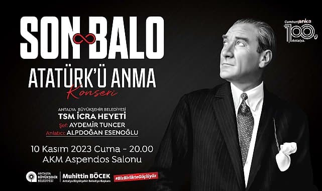 Antalya Büyükşehir Belediyesi, ölümünün 85. yılında Ulu Önder Gazi Mustafa Kemal Atatürk’ü “Son Balo” ile anacak. Şef Aydemir Tuncer yönetimindeki Türk Sanat Müziği İcra Heyeti’nin gerçekleştireceği Atatürk’ü Anma Konserinde son baloda çalınan şarkılar seslendirilecek. Antalya Büyükşehir Belediyesi Kültür ve Sosyal İşler Dairesi Başkanlığı tarafından Ulu Önder Gazi Mustafa Kemal Atatürk’ün ölümünün 85. Yıl dönümünde anma konseri düzenlenecek. 10 Kasım Cuma günü saat 20.00’de Atatürk Kültür Merkezi Aspendos Salonu’nda düzenlenecek konserde Ata’nın ölümünden 8 ay önce Bursa ziyareti sırasında Bursa Belediyesi tarafından onuruna verilen son balo canlandırılacak. Baloya katılamayacak kadar hasta olmasına rağmen baloya katılan Atatürk’ün hafızalara kazınan vals ve zeybeği de gecede canlandırılacak. Alpdoğan Esenoğlu’nun anlatımını yapacağı gecede Atatürk’ün sevdiği şarkılar seslendirilecek.