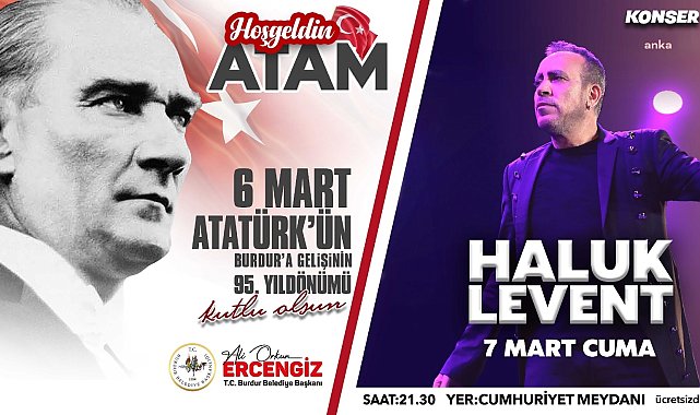 (BURDUR)- Burdur Belediyesi, Ulu Önder Gazi Mustafa Kemal Atatürk’ün Burdur’a gelişinin 95'inci yılını kutlamaya hazırlanıyor.Burdur Belediyesi, Ulu Önder Mustafa Kemal Atatürk’ün Burdur’a gelişinin 95'inci yılını kutlamaya hazırlanıyor. Bu kapsamda vatandaşlar, sanatçı Haluk Levent’in sahne alacağı konserle unutulmaz bir akşam yaşayacak. Haluk Levent konseri, 7 Mart Cuma günü saat 21:30’da Cumhuriyet Meydanı'nda düzenlenecek.