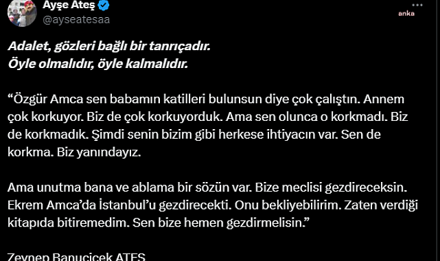 (ANKARA)- Ankara'da silahlı saldırı sonucu öldürülen eski Ülkü Ocakları Genel Başkanı Sinan Ateş'in eşi Ayşe Ateş, CHP'nin Cumhurbaşkanı adaylığı ön seçiminde ''Dayanışma Sandığı''nda oy kullandı. Ateş oy pusulasıyla birlikte kızı Zeynep Banuçiçek Ateş'in CHP Genel Başkanı Özgür Özel'e yazdığı mektubu paylaştı. Zeynep Banuçiçek mektubunda, "Özgür Amca sen babamın katilleri bulunsun diye çok çalıştın. Şimdi senin bizim gibi herkese ihtiyacın var. Sen de korkma. Biz yanındayız. Ekrem Amca da İstanbul’u gezdirecekti. Onu bekleyebilirim " ifadesini kullandı.Sinan Ateş'in eşi Ayşe Ateş, CHP'nin cumhurbaşkanı adaylığı ön seçiminde Ekrem İmamoğlu'an destek vermek için ''Dayanışma Sandığı''nda oy kullandı. Ayşe Ateş oy pusulasıyla birlikte kızı Zeynep Banuçiçek Ateş'in CHP Genel Başkanı Özgür Özel'e yazdığı mektubu, sosyal medya hesabından, "Adalet, gözleri bağlı bir tanrıçadır. Öyle olmalıdır, öyle kalmalıdır" notuyla paylaştı. Banuçiçek Ateş'in mektubu şöyle: "Özgür Amca sen babamın katilleri bulunsun diye çok çalıştın. Annem çok korkuyor. Biz de çok korkuyorduk. Ama sen olunca o korkmadı. Biz de korkmadık. Şimdi senin bizim gibi herkese ihtiyacın var. Sen de korkma. Biz yanındayız. Ama unutma bana ve ablama bir sözün var. Bize Meclis'i gezdireceksin. Ekrem Amca da İstanbul’u gezdirecekti. Onu bekleyebilirim. Zaten verdiği kitapı da bitiremedim. Sen bize hemen gezdirmelisin.''Zeynep Banuçiçek ATEŞ
