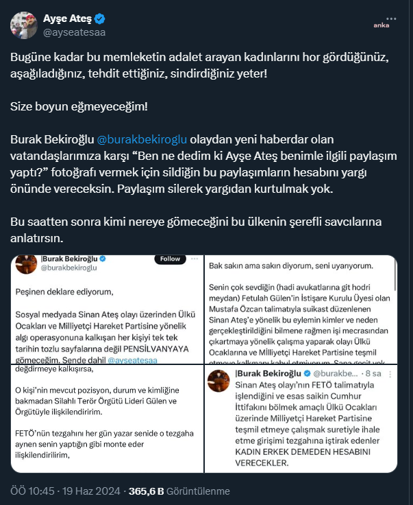 (ANKARA) - Ankara’da uğradığı silahlı saldırıda hayatını kaybeden eski Ülkü Ocakları Genel Başkanı Sinan Ateş’in eşi Ayşe Ateş, kendisini sosyal medya üzerinden tehdit eden ve sonrasında paylaşımlarını silen Burak Bekiroğlu’na "Paylaşım silerek yargıdan kurtulmak yok. Bu saatten sonra kimi nereye gömeceğini bu ülkenin şerefli savcılarına anlatırsın" dedi.Eski Ülkü Ocakları Başkanı Sinan Ateş cinayetinin aydınlatılması için siyasi partilerin genel başkanlarını ziyaret eden Ayşe Ateş, sosyal medya hesabından ölüm tehditleri aldığını duyurdu. Burak Bekiroğlu tarafından hedef gösterildiğini belirten Ateş, "Burak Bekiroğlu isimli şahıs kamuoyuna, Ankara’nın göbeğinde güpegündüz işlenen bu menfur cinayetin emrini kimlerin verdiğini isim isim sayıyor. Beni hedef göstererek tehdit içerikli açıklamalarda bulunuyor. Neden bu paylaşımları ihbar kabul edilip ifadeye çağrılmıyor, neden elindeki bilgi ve belgeler istenmiyor, tanık statüsünde dinlenmiyor? Her an öldürülme tedirginliğiyle yaşamaktan bıktık!" ifadelerini kullanmıştı.Ayşe Ateş, Adalet Bakanı Yılmaz Tunç ile İçişleri Bakanı Ali Yerlikaya'ya, "Geleni görmüyor musunuz? Bunlar ne güvenlik güçlerinden ne de adaletten korkuyor. Yazdıklarını ihbar kabul edin. Çağırın, dinleyin, iddialarının ispatını isteyin. Eğer elinde benimle, Sinan’la, bu suikastla alakalı ortaya attığı iddialara ilişkin en ufak bir kanıt varsa ortaya koysun. Yoksa da hukuken gereği neyse o yapılsın" diye de seslenmişti.Burak Bekiroğlu’nun sosyal medyadan yaptığı paylaşımları silmesi üzerine Ayşe Ateş, Bekiroğlu’nun paylaşımlarını alıntılayarak "Bu paylaşımların hesabını yargı önünde vereceksin. Paylaşım silerek yargıdan kurtulmak yok" dedi.