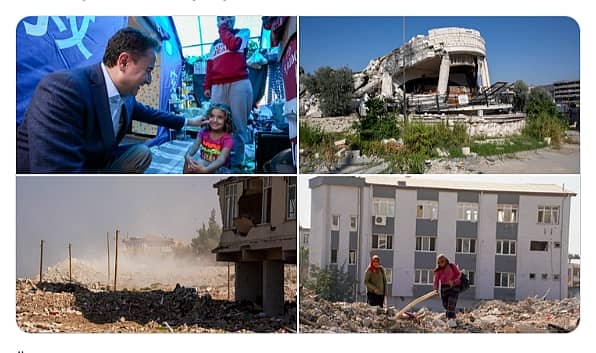 DEVA Partisi Genel Başkanı Ali Babacan, partisinin "Cumhuriyet'in 100. yılı" programı kapsamında Hatay'da depremden etkilenen yurttaşları ziyaret etti. Babacan, “Birlikte yüz yüze, nice yüzlere' diyerek yola çıktık, Hatay'dayız. Açılan yaraları unutmadan, birlikte sarmalıyız ki birbirimize bakacak yüzümüz olsun. Cumhuriyetimizin nice yüz yılları olsun" dedi.