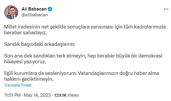 Demokrasi ve Atılım (DEVA) Partisi Genel Başkanı Ali Babacan, “Millet iradesinin net şekilde sonuçlara yansıması için tüm kadrolarımızla beraber sahadayız. Sandık başındaki arkadaşlarım: Son ana dek sandıkları terk etmeyin, hep beraber büyük bir demokrasi hikayesi yazıyoruz. İlgili kurumlara da sesleniyorum: Vatandaşlarımızın doğru haber alma hakkını geciktirmeyin” dedi.DEVA Partisi Genel Başkanı Ali Babacan, Twitter hesabından seçmenlerden sandığa sahip çıkmaları çağrısında bulundu. Babacan’ın paylaşımı şöyle:“Millet iradesinin net şekilde sonuçlara yansıması için tüm kadrolarımızla beraber sahadayız. Sandık başındaki arkadaşlarım: Son ana dek sandıkları terk etmeyin, hep beraber büyük bir demokrasi hikayesi yazıyoruz. İlgili kurumlara da sesleniyorum: Vatandaşlarımızın doğru haber alma hakkını geciktirmeyin.”