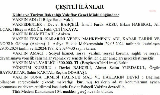 ANKARA - MHP Genel Başkanı Devlet Bahçeli'nin de aralarında olduğu Ankara merkezli ''İl Bilge Hatun Vakfı'' Kuruldu.Kültür ve Turizm Bakanlığı Vakıflar Genel Müdürlüğü'nün Resmi Gazete'de yayımlanan ilanına göre, Ankara merkezli ''İl Bilge Hatun Vakfı'' kuruldu.Vakfın amacı, ''Sosyal hizmet, sosyal yardım, sosyal koruma, sağlık ve sosyal dayanışmaya yönelik çalışmalar yapmak ve senette belirtilen diğer amaçları gerçekleştirmektir'' şeklinde ifade edildi.Vakfedenler ise MHP Lideri Devlet Bahçeli, İsmail Faruk Aksu, Erkan Haberal, Ali Uçak, Hüseyin Akgül ve Fatih Çetinkaya oldu.Vakfın tescil kararını Ankara Gölbaşı 1. Asliye Hukuk Mahkemesi verirken, yönetim kurulunda ise Devlet Bahçeli, Ahmet Selim Yurdakul, Özgür Bayraktar, Şahin Kartal ve Seçkin Odaşı yer alıyor. Mal varlığı ise 500 bin TL olarak açıklandı. İlanda, vakfın sona ermesi halinde mal ve haklarının Devlet Bahçeli Vakfına devredileceği belirtildi. Vakfedenler kimler?Bahçeli dışında vakfedenler arasında yer alan İsmail Faruk Aksu, MHP’de Ekonomik ve Sosyal Politiklardan sorumlu Genel Başkan Yardımcısı olarak görev yapıyor. Erkan Haberal 26 ve 27. dönemde, Hüseyin Akgül ise 21. dönemde MHP milletvekili olarak görev yaptı. Ali Uçak ve Fatih Çetinkaya ise halen MHP MYK üyesi.Vakın Yönetim Kurulu kimlerden oluşuyor?MHP lideri Devlet Bahçeli vakfın yönetim kurulunda da yer aldı. Diğer yönetim kurulu üyeleri Ahmet Selim Yurdakul MHP Aile, Kadın ve Sosyal Hizmet Politiklardan Sorumlu Genel Başkan Yardımcısı, Özgür Bayraktari, Şahin Kartal ve Seçkin Odabaşı MHP MYK üyesi.
