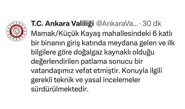 Ankara Valiliği tarafından yapılan açıklamada doğalgazdan kaynaklı olduğu belirtilerek bir kişinin hayatını kaybettiği açıklandıYapılan açıklama şöyle:"Mamak/Küçük Kayaş mahallesindeki 6 katlı bir binanın giriş katında meydana gelen ve ilk bilgilere göre doğalgaz kaynaklı olduğu değerlendirilen patlama sonucu bir vatandaşımız vefat etmiştir. Konuyla ilgili gerekli teknik ve yasal incelemeler sürdürülmektedir."