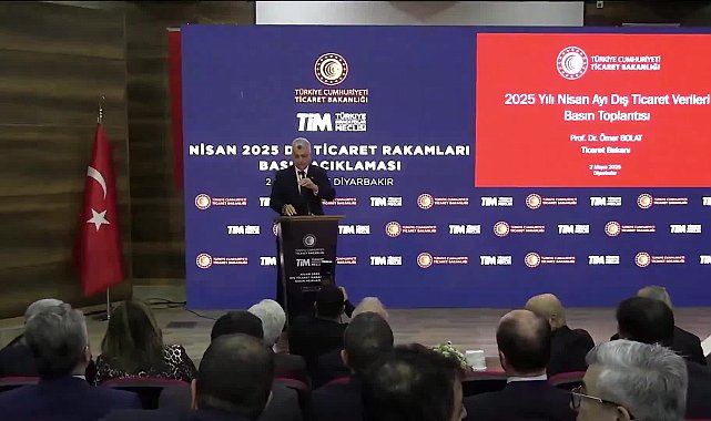 Haber: Ahmet ÜN – Kamera: İsmet MİKAİLOĞULLARI(DİYARBAKIR) - Ticaret Bakanı Ömer Bolat, nisan ayı dış ticaret verilerini açıkladı. Cumhuriyet tarihinin en yüksek 12 aylık ihracatının gerçekleştiğini söyleyen Bolat, "Nisanda mal ihracatımız geçen yılın aynı ayına göre yüzde 8,5 artışla 20,9 milyar dolara yükselmiştir. En yüksek ikinci nisan ayı rakamı elde edildi. Nisan ayında ithalat yüzde 12,9 artışla 33 milyar dolar oldu " dedi.Ticaret Bakanı Ömer Bolat, Diyarbakır’da düzenlendiği toplantıda nisan ayı dış ticaret verilerini açıkladı. Yatırım İzleme Koordinasyon Başkanlığı’nda yapılan toplantıya Bakan Bolat’ın yanı sıra Diyarbakır Valisi Murat Zorluoğlu, AK Parti milletvekilleri Galip Ensarioğlu, Mehmet Sait Yaz, Suna Kepolu, Diyarbakır Ticaret ve Sanayi Odası (DTSO) Başkanı Mehmet Kaya, kentteki iş dünyası temsilcileri, kamu kurum ve kuruluşu yöneticileri ve çok sayıda davetli katıldı.Bolat, toplantıda yaptığı konuşmada, enerji savaşları ve enflasyonist baskılar gümrük vergilerini yükseltme ve korumacılığın artırılması şekilde ticaret savaşları küresel ticaretin gidişatı konusunda önemli bir belirsizlik faktörü olarak artmakta olduğuna dikkati çekti.Dünya ekonomisindeki tahminler ve beklentilerin bir miktar aşağı doğru çekildiğini kaydeden Bolat, Dünya Ticaret Örgütü’nün (DTÖ) bu yıl dünya ticareti için yüzde 0,2 daralma beklediğini ifade etti. Bolat, ''IMF Dünya Bankası, OECD gibi kuruluşlar da tahminlerini aşağı çektiler. IMF büyüme tahminini yüzde 2,8'e çekildi. Dünya ticareti tahmini yüzde 0,5 aşağı çekildi. OECD de tahminlerini aşağı çekti. AB, Euro Bölgesi için tahminlerde büyüme ve ticaret tahminleri de geriye çekildi. Türkiye ekonomisine baktığımızda IMF Türkiye için büyüme tahmini 0,1 puan artırdı. Dünya Bankası ve OECD de Türkiye için büyüme tahminini yüzde 3,1'e yükselttiler” diye konuştu.''2025 ilk çeyrek büyümesinde olumlu artış bekliyoruz''