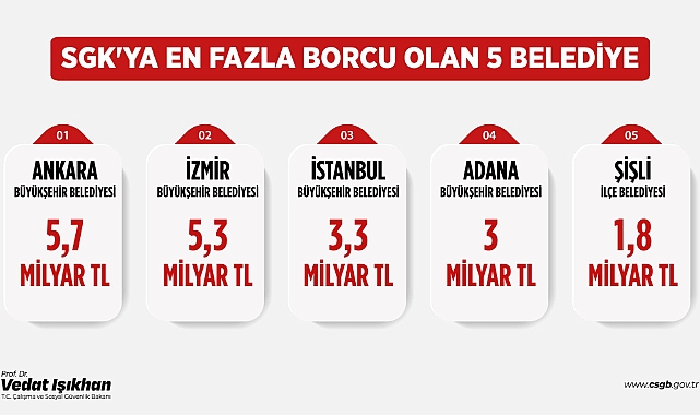 (ANKARA) - Çalışma ve Sosyal Güvenlik Bakanı Vedat Işıkhan, sosyal medya hesabından, SGK'ya en çok borcu olan belediyeleri açıkladı. Bakan Işıkhan, X hesabından yaptığı açıklamada SGK'ya en fazla prim borcu olan 5 belediyeyi paylaştı.Işıkhan, açıklamasında şunları kaydetti:"Belediyelerin SGK’ya olan prim borçları ile ilgili birtakım gerçekleri aziz milletimize aktarmamız ve CHP’li bazı yetkililerin ortaya attığı yanlış bilgileri düzeltmemiz gerekiyor. SGK’ya en fazla prim borcu olan 5 belediyenin tamamı CHP’li belediyelerdir. Bu gerçek yerel seçimler öncesinde de böyleydi. Seçimlerden önce yaptığımız açıklamada da bunu ifade etmiştik. Türkiye genelinde belediyelerin SGK’ya olan toplam prim borcu 96 milyar TL’ye ulaşmış durumda. Bu borçların yüzde 67,7’si tek başına CHP’li belediyelere ait. SGK’ya en fazla prim borcu olan Ankara Büyükşehir Belediyesi’nin borcu 5 milyar 751 milyon TL’dir. Belediyeyi 2019’da AK Parti’den devraldığında borcu 225 milyon TL iken, bugün itibarıyla 25,5 katına çıkmıştır. Dolayısıyla 'seçim oldu' diyerek kafa karışıklığı yaratmaya, aziz milletimizi yalanlarla aldatmaya çalışmanın kimseye faydası yoktur. CHP’li belediye başkanlarına tavsiyemiz emekçilerin alın terinin hakkı olan sigorta primlerini bir an evvel ödemeleridir. Meseleyi siyasi parti rekabeti veya hamaset üzerinden değil veriler ve rakamlar üzerinden sadece gerçekleri söyleyerek paylaşmamız gerekiyor."Ne olmuştu?Cumhurbaşkanı Recep Tayyip Erdoğan, partisinin grup toplantısında yaptığı konuşmada, CHP Genel Başkanı Özgür Özel’e seslenerek, "Emeklilere faydanız dokunsun istiyorsanız talimat verin, belediyeleriniz Sosyal Güvenlik Kurumu'na olan birikmiş borçlarını ödesin. Şu anda belediyelerin borçlarıyla ilgili Hazine ve Maliye Bakanlığımız bu borçların tahsiline kaynağında başlayacaktır. Öyle 25 kuruşa simit yok" ifadesini kullanmıştı.CHP lideri Özel, Erdoğan'a şöyle tepki göstermişti:"Bunlar ucuz oyunlar, bu sefer mali darbe yapmaya çalışıyor. Ellerinden aldığımız tüm belediyeler hiç borç ödememiş. Millet bu zihniyetten bıktığı için bize oy verdi. Hangi AK Partili belediye bu zamana kadar borcunu ödemiş? Biz iktidara gelmeyelim diye belediyelerimizi iş yapamaz hale getirmeye çalışıyor. 2019’da YSK eliyle İmamoğlu’na ‘adli darbe’ yaptılar. Demokrasi tokadı yediler. Bu sefer SGK borçları üzerinden ‘mali darbe’ yapıp belediyeyi çalışamaz hale getirirlerse demokrasi tokadı yerler. Çöpleri kendi ellerimizle toplar yine de onun şantajına boyun eğmeyiz."