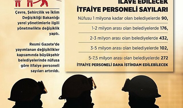 (ANKARA)-Çevre, Şehircilik ve İklim Değişikliği Bakanı Murat Kurum, Yerel yönetimlerle ilgili yönetmeliği güncelleyerek büyükşehir belediyelerinde nüfusa göre itfaiye personeli sayılarını arttırdıklarını açıkladı.Çevre, Şehircilik ve İklim Değişikliği Bakanlığı yerel yönetimlerle ilgili yönetmelikte değişiklik yaptı. Resmi Gazete'de yayımlanan değişiklikler kapsamında büyükşehir belediyelerinde nüfusa göre itfaiye personeli sayıları artırıldı. Konuya İlişkin Çevre, Şehircilik ve İklim Değişikliği Bakanı Murat Kurum sosyal medya hesbından paylaşımda bulundu. Yapılan paylaşımda şu ifadelere yer verildi:“İlave edilecek itfaiye personeli sayıları: Nüfusu 1 milyona kadar olan belediyelerde 90, 1-2 milyon arası olan belediyelerde 176, 2-3 milyon arası olan belediyelerde 432, 3-5 milyon arası olan belediyelerde 102, 5-7,5 milyon arası olan belediyelerde 272itfaiye personeli daha istihdam edilecek. Yürürlüğe giren yönetmelik değişiklikleri en geç 6 ay içerisinde uygulanacak.”