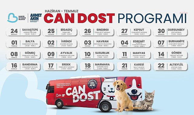 (BALIKESİR) - Balıkesir Büyükşehir Belediyesi'nin ilçeleri dolaşarak sokak hayvanlarına ücretsiz tedavi desteği sağlayan mobil hayvan bakım ve tedavi aracı “Can Dost”un, haziran ve temmuz takvimi belli oldu. Araç, belirli günlerde farklı ilçelerde kuduz aşısı ve parazit uygulamasının yanı sıra yaralı hayvanları da tedavi edecek.Balıkesir'in tüm ilçelerinde sokak hayvanlarının sağlık koşullarını iyileştirmek amacıyla hizmet veren “Can Dost” ile hayvanların sağlık taramaları ve tedavileri gerçekleştiriliyor. Sokak hayvanlarına uzman veteriner hekimler tarafından parazit uygulaması ve kuduz aşısı yapılıyor.Belirli günlerde, belirlenen ilçelerde hizmet veren Can Dost, 10.00 ile 16.00 saatleri arasında faaliyet gösteriyor. Can Dost, 18 Temmuz Marmara Adası’nın saatleri feribot seferlerine bağlı olarak değişiklik gösterdiği için yalnızca 18 Temmuz’da Marmara Adası’nda 14.00-16.00 saatleri arasında hizmet verecek.Can Dost'un haziran ve temmuz ayı programı belli oldu. İlk olarak 24 Haziran (bugün) Savaştepe Hürriyet Meydanı’nda hizmet verecek araç, 25 Haziran'da (yarın) Bigadiç Pazar Yeri, 26 Haziran'da Sındırgı Cumhuriyet Meydanı, 27 Haziran'da Kepsut Cumhuriyet Meydanı, 30 Haziran'da Dursunbey Kent Meydanı'nda olacak.Balıkesir Büyükşehir Belediyesi Çevre Koruma ve Kontrol Dairesi Başkanlığı bünyesinde hizmet veren Can Dost, 1 Temmuz'da Balya Cumhuriyet Meydanı, 2 Temmuz'da İvrindi Atatürk Meydanı, 3 Temmuz'da Havran Eski Belediye Önü ve 4 Temmuz'da Edremit-Altınoluk Cumhuriyet Meydanı’nda olacak.Takvim, 7 Temmuz'da Burhaniye Cumhuriyet Meydanı, 8 Temmuz'da Gömeç Cumhuriyet Meydanı ve 9 Temmuz'da Ayvalık Cumhuriyet Meydanı ile devam edecek.Can Dost, 10 Temmuz'da Susurluk Heykel Meydanı’nda, 11 Temmuz'da Manyas Atatürk Meydanı’nda, 14 Temmuz'da Gönen Hükümet Meydanı’nda ve 16 Temmuz'da Bandırma Cumhuriyet Meydanı’nda hizmet verecek.Sokak hayvanları için tüm klinik imkanları seferber eden Can Dost’un takvimi, 17 Temmuz'da Erdek Cumhuriyet Meydanı ve 18 Temmuz'da Marmara Adası’nın ardından 21 Temmuz'da Karesi Millet Bahçesi ve 22 Temmuz'da Altıeylül Atatürk Parkı’nda tamamlanacak.