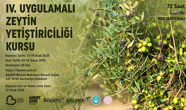(BALIKESİR) - Balıkesir Çiftçi Eğitim Merkezi’nde (BAÇEM) 3-14 Şubat 2025 tarihleri arasında düzenlenecek IV. Uygulamalı Zeytin Yetiştiriciliği Kursu için başvurular başladı. Balıkesir tarımını geliştirmek ve doğru yöntemlerle zeytin üretimini artırmak amacıyla yapılacak eğitimler sonunda kursiyerlere MEB onaylı sertifika verilecek.Balıkesir’de çiftçilere yönelik eğitimler ürün kalitesini ve rekolteyi artırmayı hedefliyor. “Tarımda Balıkesir Modeli” ile örnek projeleri hayata geçiren Balıkesir Büyükşehir Belediyesi'nin Kırsal Hizmetler Daire Başkanlığı’na bağlı Çiftçi Eğitim Merkezi’nde, 3-14 Şubat 2025 tarihleri arasında IV. Uygulamalı Zeytin Yetiştiriciliği Kursu düzenlenecek.Kontenjan 50 kişi ile sınırlıBAÇEM, Burhaniye Halk Eğitim Merkezi ve BALMEK ortaklığında düzenlenen kursa başvurular, 19 Ocak Pazar gününe kadar devam edecek. Kontenjanı 50 kişi ile sınırlı olan kursa başvuru yapmak isteyenler, ‘https://basvur.balikesir.bel.tr/ZYK4’ bağlantısına tıklayarak başvuruda bulunabilecek.Yüz yüze uygulamalı yürütülecek 72 saatlik kurs programı sonunda katılımcılara MEB onaylı sertifika verilecek.