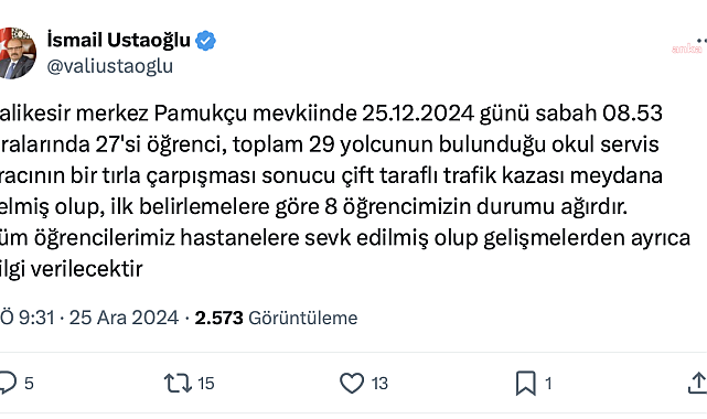 (BALIKESİR)- Balıkesir'de okul servisi tırla çarpıştı, ilk belirlemelere göre 8 öğrenci ağır yaralandı.Balıkesir İzmir yolu Pamukçu mevkiinde sabah saatlerinde 29 yolcunun bulunduğu okul servis aracı ile bir tır çarpıştı. Kazaya ilişkin sosyal medya hesabından açıklama yapan Balıkesir Valisi İsmail Ustaoğlu, "Balıkesir merkez Pamukçu mevkiinde 25 Aralık 2024 günü sabah 08.53 sıralarında 27'si öğrenci, toplam 29 yolcunun bulunduğu okul servis aracının bir tırla çarpışması sonucu çift taraflı trafik kazası meydana gelmiş olup, ilk belirlemelere göre 8 öğrencimizin durumu ağırdır. Tüm öğrencilerimiz hastanelere sevk edilmiş olup gelişmelerden ayrıca bilgi verilecektir" ifadelerini kullandı.