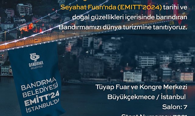 Bandırma dünyanın en büyük turizm fuarlarından 27. Doğu Akdeniz Uluslararası Turizm ve Seyahat Fuarı’nda (EMITT’ 2024) yerini almaya hazırlanıyor.27. Doğu Akdeniz Uluslararası Turizm ve Seyahat Fuarı, 6-9 Şubat 2024 tarihleri arasında İstanbul TÜYAP Kongre ve Fuar Merkezi’nde gerçekleştirilecek.Bandırma Belediyesi, kenti anlatan ve tanıtan çeşitli ürün ve etkinliklerle 7. salonda bulunan 7321 numaralı stantta ziyaretçilerini misafir etmeye hazırlanıyor.Bandırma Belediyesi standı, geçen yıl fuarın en prestijli ödüllerinden biri olan “En Etkin Tanıtım Ödülü” ünvanına ve ödülüne layık görülmüştü.
