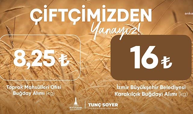 İzmir Büyükşehir Belediye Başkanı Tunç Soyer, atalık tohumla üretim yapan çiftçilere müjde verdi. Soyer, Twitter hesabından yaptığı paylaşımda; çiftçilerin atalık tohumla ürettiği karakılçık buğdayını Toprak Mahsulleri Ofisi’nin verdiği fiyatın iki katını vererek kilogramı 16 liradan satın alacaklarını açıkladı.İBB Başkanı Tunç Soyer, atalık tohumla üretim yapan çiftçilerin buğdayını TMO’nun kilogram başına verdiği 8.25 liranın iki katını vererek üreticiden 16 liradan satın alacaklarını duyurdu. Soyer, Twitter hesabından yaptığı paylaşımda şu açıklamayı yaptı:“Üreticilerimizi enflasyona ezdirmeyecek, Atalık tohumlara destek vermeyi sürdüreceğiz. Bu sene de atalık tohumla üretim yapan üreticimizin buğdayını 2 katı bedelle satın alacağız”Soyer paylaşımına TMO'nun buğday alım fiyatı olan 8,25 lira ile İzmir Büyükşehir'in alım fiyatı olan 16 liranın yan yana yer aldığı "çiftçimizin yanındayız" başlıklı bir görseli de ekledi.