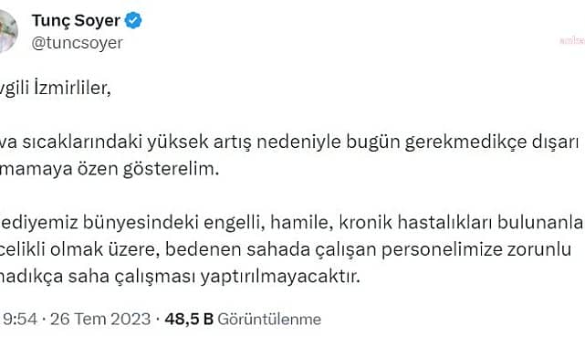 KERİM UĞURİzmir Büyükşehir Belediye Başkanı Tunç Soyer, hava sıcaklıklarının mevsim normallerinin üzerinde seyretmeye başlamasına dikkat çekerek “Sevgili İzmirliler, hava sıcaklarındaki yüksek artış nedeniyle bugün gerekmedikçe dışarı çıkmamaya özen gösterelim” dedi. Başkan Soyer, belediye personelinin zorunlu olmadıkça saha çalışması yapmayacağını açıkladı.Hava sıcaklıklarının mevsim normallerinin üzerinde seyretmeye başlamasının ardından İzmir Büyükşehir Belediye Başkanı Tunç Soyer, bugün sosyal medya hesabı üzerinden İzmirlilere uyarılarda bulunarak belediye personelinin zorunlu olmadıkça saha çalışması yapmayacağını açıkladı.Başkan Soyer’in paylaşımı şöyle:“Sevgili İzmirliler, hava sıcaklarındaki yüksek artış nedeniyle bugün gerekmedikçe dışarı çıkmamaya özen gösterelim. Belediyemiz bünyesindeki engelli, hamile, kronik hastalıkları bulunanlar öncelikli olmak üzere, bedenen sahada çalışan personelimize zorunlu olmadıkça saha çalışması yaptırılmayacaktır”