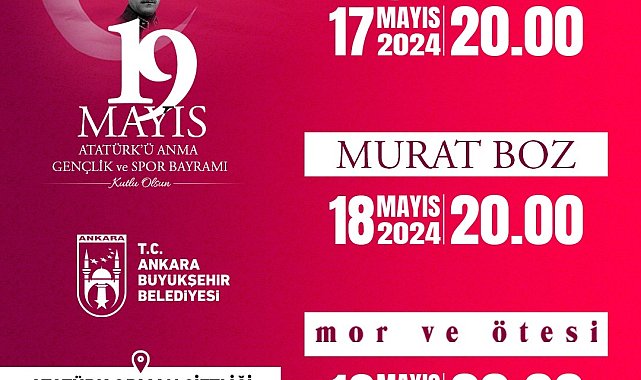 (ANKARA) - Ankara Büyükşehir Belediyesi (ABB), Başkentlileri 19 Mayıs’ta sevdiği sanatçılarla buluşturacak. Başkent, 19 Mayıs Atatürk’ü Anma Gençlik ve Spor Bayramı’nı büyük bir coşkuyla kutlamaya hazırlanıyor. Kutlamalar, 17 Mayıs Cuma sanatçı Gülşen’in konseri ile başlayacak, 18 Mayıs Cumartesi Murat Boz ve 19 Mayıs Pazar Mor ve Ötesi konserleriyle devam edecek. Atatürk Orman Çiftliği Doğal Yaşam Parkı’nda düzenlenecek konserler için saat 16.00’dan itibaren Sıhhiye Zafer Çarşısı önünden ücretsiz ring seferleri düzenlenecek.