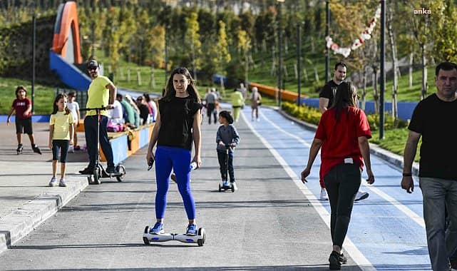 Sonbaharın ve sıcak havanın tadını çıkaran ebeveynler, çocuk oyun alanlarını kullanan ve bisiklet parkurunda paten ile scooter süren minikler hafta sonu doyasıya eğlendi.
