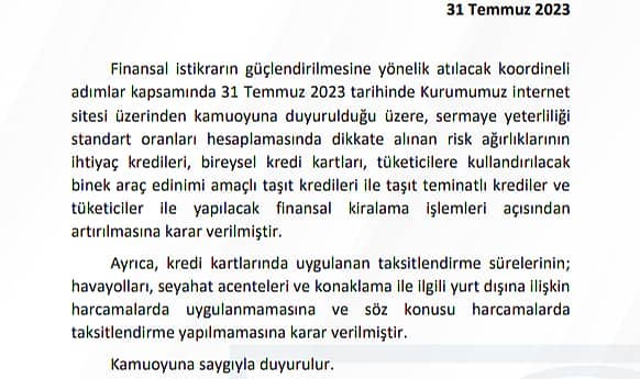 Bankacılık Düzenleme ve Denetleme Kurumu (BDDK), kredi kartlarında taksitli harcamalara yönelik yeni kararlar aldı. Alınan karara göre; havayolları, seyahat acenteleri ve konaklama ile ilgili yurt dışına ilişkin harcamalarda taksit yapılmayacak.BDDK, bugün kredi kartlarında taksitli harcamalara yönelik yeni kararlar aldı. BDDK, yeni kararları yaptığı yazılı basın açıklamasıyla duyurdu. Buna göre; havayolları, seyahat acenteleri ve konaklama ile ilgili yurt dışına ilişkin harcamalarda taksit uygulaması kaldırıldı.BDDK’nın yazılı açıklaması şöyle:“Finansal istikrarın güçlendirilmesine yönelik atılacak koordineli adımlar kapsamında 31 Temmuz 2023 tarihinde Kurumumuz internet sitesi üzerinden kamuoyuna duyurulduğu üzere, sermaye yeterliliği standart oranları hesaplamasında dikkate alınan risk ağırlıklarının, ihtiyaç kredileri, bireysel kredi kartları, tüketicilere kullandırılacak binek araç edinimi amaçlı taşıt kredileri ile taşıt teminatlı krediler ve tüketiciler ile yapılacak finansal kiralama işlemleri açısından artırılmasına karar verilmiştir.Ayrıca, kredi kartlarında uygulanan taksitlendirme sürelerinin; havayolları, seyahat acenteleri ve konaklama ile ilgili yurt dışına ilişkin harcamalarda uygulanmamasına ve söz konusu harcamalarda taksitlendirme yapılmamasına karar verilmiştir.”