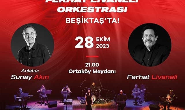 Beşiktaş Belediyesi, Türkiye Cumhuriyeti’nin kuruluşunun 100. yılı kapsamında 28 Ekim Cumartesi günü Sunay Akın'ın anlatıcılığı eşliğinde Ferhat Livaneli Orkestrası’nın İstanbullularla buluşacağı bir konser düzenliyor.Cumhuriyetin 100. yılı kutlamaları kapsamında birçok etkinlik ve konser düzenleyen Beşiktaş Belediyesi, 28 Ekim’de de vatandaşları Ortaköy Meydanı’nda bir araya getiriyor.Ferhat Livaneli Orkestrası, Sunay Akın'ın anlatıcılığı eşliğinde dinleyicilerle buluşacak. Zülfü Livaneli ile uzun yıllar çalışan ve çok sayıda Livaneli albüm ve film müziklerinin yönetmenliğini yapmış Ferhat Livaneli Orkestrası zengin repertuvarını, Beşiktaşlılar için seslendirecek. Sunay Akın ise kendine has üslubuyla anlattığı tarihi hikâyelerle geceye renk katacak.