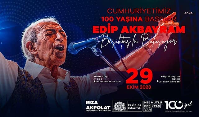 Cumhuriyet Bayramı’nın 100. yılı dolayısıyla özel kutlamalara imza atan Beşiktaş Belediyesi, Fener alayı ve Edip Akbayram konseriyle de bu kutlamaları taçlandıracak. Beşiktaş Belediye Başkanı Rıza Akpolat bu önemli günde tüm Beşiktaşlıları kutlamalara katılmaya davet etti.Gazi Mustafa Kemal Atatürk ve silah arkadaşlarının Kurtuluş Savaşı için ilk adımı attığı ve milli mücadelenin fitilini ateşlemek için yola çıktığı Beşiktaş’ta 29 Ekim Cumhuriyet Bayramı’nın 100. yılı çeşitli etkinliklerle kutlanıyor. Kutlamalar kapsamında Beşiktaş Belediyesi’ne ait ses araçları gün boyu tüm ilçeyi gezecek. Beşiktaş’ta gündüz saatlerinden itibaren Cumhuriyet Bayramı coşkusunu yansıtan marşlar ilçenin cadde ve sokaklarında yankılanacak. Yine bayrama özel hazırlanan bando ekipleri ezgileriyle Beşiktaşlıları coşturacak.FENER ALAYI DOLMABAHÇE SARAYI ÖNÜNDEN BAŞLAYACAKSaatler 19.00’u gösterdiğinde Dolmabahçe Sarayı önünden Beşiktaş Belediye Başkanı Rıza Akpolat’ın komşularıyla birlikte yürüyeceği Fener Alayı başlayacak. 7’den 70’e binlerce vatandaş ellerinde Türk bayrakları, Atatürk posterleri, meşaleler, dillerinde marşlarla birlikte Ortaköy Meydanı’na yürüyecek.SAHNEDE DEV İSİM: EDİP AKBAYRAMEtkinliklerin son durağı ise Ortaköy Meydanı olacak. Usta sanatçı Edip Akbayram saat 21.00’da sahne alacak ve konserdeki vatandaşlara unutulmaz anlar yaşatacak.