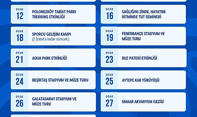 (İSTANBUL)- Beykozluların yüzmeden buz patenine, stadyum gezilerinden doğa yürüyüşlerine kadar ücretsiz yaralandığı ocak ayı etkinlik takvimi yayınlandı. Beykoz Belediyesi tarafından 8 branşta hazırlanan 13 farklı spor etkinliğinden, 8 yaş ve üzeri tüm ilçe sakinleri faydalanabilecek.Beykoz Belediyesi'nin 8 branşta hazırlanan 13 farklı spor etkinliğine yer verdiği etkinlik takvimi açıklandı.Merkeze uzak mahallelerde yaşayan çocuklara yüzme becerisi kazandırmak amacıyla hazırlanan "Yüzme Bilmeyen Kalmasın" projesiyle 8-13 yaş aralığındaki 200 çocuğa eğitim verilecek. Proje kapsamında başlayacak birinci eğitim döneminde Cumhuriyetköy, Alibahadır, Paşamandıra, İshaklı, Bozhane, Öğümce, Kılıçlı ve Göllü mahalleleri bulunuyor. Programa katılmak isteyen vatandaşların, mahalle muhtarlarıyla iletişime geçmeleri yeterli olacak. Dersler, Çavuşbaşı Kapalı Yüzme Havuzu’nda yapılacak. Beykoz Belediyesi, 8-15 yaş aralığındaki çocuk ve gençlere ara tatil boyunca buz pateninden biniciliğe, patenden su kaydırağına birçok etkinlik alternatifi sunacak. İstanbul Büyükşehir Belediyesi (İBB) Hidayet Türkoğlu Spor Kompleksi tesislerinde yer alan Aquapark’ta eğlenceli vakit geçirme fırsatı bulacak olan çocuklar, Göllü Binicilik Tesisleri’nde at binme deneyimi yaşayacak. Emaar Akvaryum Gezisi ile öğrenciler sualtı dünyasını ve deniz canlılarını keşfedecek, İBB Silivri Kapı Buz Pisti’nde ise paten kayacak. Türk futbolunun üç büyük kulübü Fenerbahçe, Galatasaray ve Beşiktaş, stadyum ve müze turlarıyla çocuklara tanıtılacak. Ocak ayında, sporseverlere hareket ve sağlık katacak etkinlikler kapsamında 16 yaş ve üzeri ilçe sakinlerine yönelik doğa gezileri de düzenlenecek. Polonezköy Tabiat Parkı Trekking ve Aytepe Kar Yürüyüşü programlarıyla katılımcılar doğayla iç içe vakit geçirecek. Ocak takvimi kapsamında Sporcu Gelişim Kampı ve ilçede spor bilincini artıracak bir de seminer düzenlenecek. Vatandaşlar, spor takvimine Beykoz Belediyesi internet sitesi üzerinden ulaşabilecek.