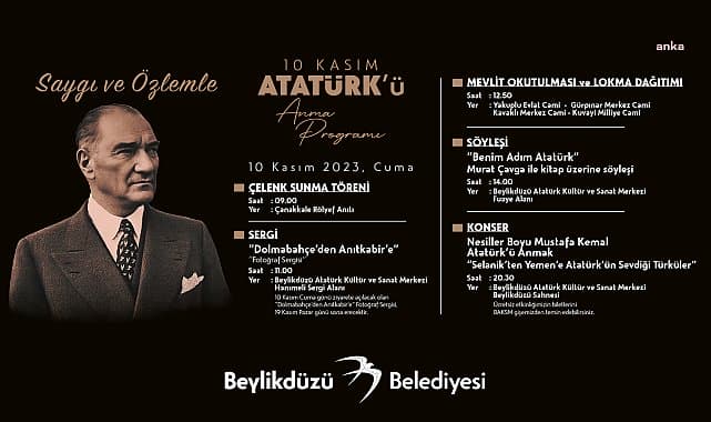 Günün sonunda ise BAKSM Beylikdüzü Sahnesi’nde Beylikdüzü Halk Müziği Topluluğu, Beylikdüzü Çok Sesli Çocuk Korosu, Beylikdüzü Sufi Meşk Topluluğu ve Beylikdüzü Çok Sesli Gençlik Korosu tarafından Nesiller Boyu Mustafa Kemal Atatürk’ü Anmak “Selanik’ten Yemen’e Atatürk’ün Sevdiği Türküler” konser programı gerçekleştirilecek.