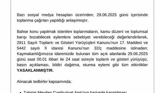 (İSTANBUL) - Beyoğlu Kaymakamlığı, ilçede bu gece 00.01'den itibaren 24 saat süreyle toplantı ve gösteri yürüyüşü, basın açıklaması, bildiri dağıtma, oturma eylemi gibi tüm etkinliklerin yasaklandığını, Taksim Meydanı, Gezi Parkı, Sıraselviler Caddesi ve İstiklal Caddesi’nin Tünel Meydanı’na kadar yaya ve araç trafiğine kapatılacağını bildirdi.Beyoğlu Kaymakamlığından yapılan açıklamada, bazı sosyal medya hesapları üzerinden toplanma çağrıları yapıldığını belirterek, şöyle denildi:''Bazı sosyal medya hesapları üzerinden: 29.06.2025 günü içerisinde toplanma çağrıları yapıldığı anlaşılmıştır. Bahse konu yapılmak istenilen toplanmaların, kamu düzeni ve toplumsal barışı bozabilecek eylemlere sebebiyet verebileceği değerlendirilerek, 2911 Sayılı Toplantı ve Gösteri Yürüyüşleri Kanunu’nun 17. maddesi ve 5442 sayılı İl idaresi Kanunu’nun 32 (ç) maddesine istinaden: Kaymakamlığımızca idaremizde bulunan tüm açık alanlarda 29.06.2025 günü saat 00.01 itibari ile 24 saat süreyle toplantı ve gösteri yürüyüşü, basın açıklaması, bildiri dağıtma, oturma eylemi gibi tüm etkinlikler yasaklanmıştır.Alınacak tedbirler kapsamında,Taksim Meydan Cumhuriyet Anıtı’nın bariyerlerle kapatılması,Taksim Meydan, Gezi Parkı, Sıraselviler Caddesi’nin ve İstiklal Caddesi’nin Tünel Meydanı’na kadar bariyerleme sureti ile bağlı sokaklar da dahil araç ve yaya trafiğine kapatılması, gerekirse kontrollü geçiş yapılmasına,Aynı gün içerisinde ilçemiz genelinde meydana gelmesi muhtemel toplumsal olaylar dikkate alınarak, ihtiyaç görülmesi halinde ilçe sınırları içerisinde farklı noktalarda yaya ve araç trafiğinin kapatılmasına karar verilmeştir.''