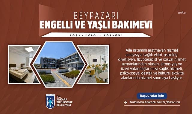 Ankara Büyükşehir Belediyesi Sosyal Hizmetler Daire Başkanlığı'nın altmış yaş ve üzeri vatandaşlara sağlık hizmeti, psiko-sosyal destek ve kültürel aktivite alanlarında hizmet verecek olan Beypazarı Engelli ve Yaşlı Bakımevi için ön kayıtlar başladı. Ön kayıt yaptırmak isteyen aileler, 'https://huzurevi.ankara.bel.tr/basvuru' internet adresinden başvuru yapabilecek.