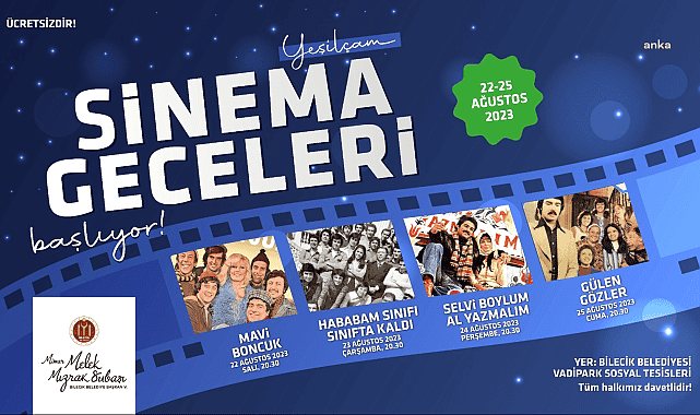 Bilecik Belediyesi, 22-25 Ağustos günleri arasında Vadipark Sosyal Tesisleri'nde "Yeşilçam Sinema Geceleri" düzenleyecek.Bilecik Belediyesi, 22-25 Ağustos 2023 tarihleri arasında ücretsiz sinema geceleri düzenleyecek. Bilecik Belediyesi Vadipark Sosyal Tesisleri’nde düzenlenecek sinema geceleri kapsamında 22 Ağustos Salı günü saat 20.30’da “Mavi Boncuk”, 23 Ağustos Çarşamba günü saat 20.30’da “Hababam Sınıfı Sınıfta Kaldı”, 24 Ağustos Perşembe günü saat 20.30’da “Selvi Boylum Al Yazmalım” ve 25 Ağustos Cuma günü aynı saatte “Güzel Gözler” sinemaseverlerle buluşturacak.