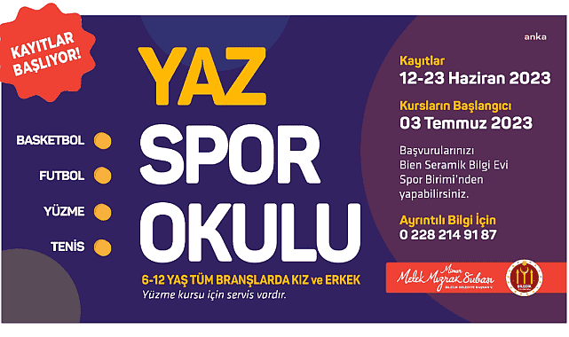 Bilecik Belediyesi tarafından her yıl düzenlenen Yaz Spor Okulları için yeni dönem kayıtları, 12 Haziran’da başlıyor. Çocukların verimli bir yaz dönemi geçirmeleri amacıyla Bilecik Belediyesi tarafından yaşama geçirilen Yaz Spor Okulları kapsamında basketbol, futbol, yüzme ve tenis kursları verilecek. Spor okullarına başvurular, 12-23 Haziran günleri arasında yapılacak.Kurslar ise Bilecik Belediyesi Bien Seramik Bilgi Evi Spor Birimi’nde 3 Temmuz itibarıyla başlayacak. 6-12 yaş arasındaki çocukların kayıt yaptırılacağı okullarda yüzme kursları için ulaşım hizmeti de verilecek. Vatandaşlar ayrıntılı bilgi için 0 228 214 91 87 numaralı telefonları arayabilecek.