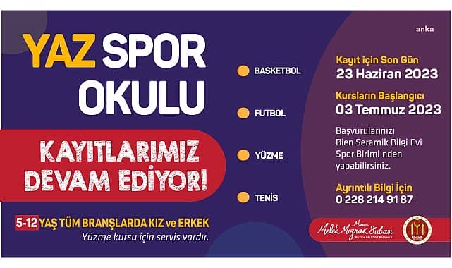 5-12 yaş arasındaki çocukların basketbol, futbol, yüzme ve tenis spor dallarında eğitim alabileceği Yaz Spor Okulları'na kayıt başvuruları, Bilecik Belediyesi Bien Seramik Bilgi Evi’nde yapılacak.