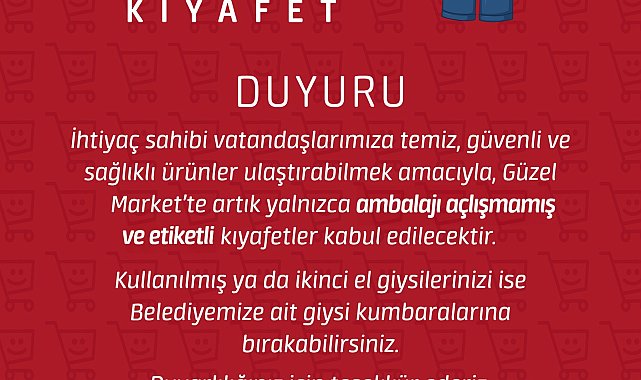 (BİLECİK)- Bilecik Belediyesi, ihtiyaç sahiplerine daha temiz ve güvenli ürünleri ulaştırabilmek için Güzel Market'te ambalajı açılmamış veya etiketli kıyafetleri bağış olarak kabul edecek.Bilecik Belediyesi, "Güzel Market" projesiyle ihtiyaç sahipleri ile hayırseverler arasında köprü olmaya devam ediyor.Belediye'den yapılan açıklamada, "Güzel Market aracılığıyla ihtiyaç sahibi vatandaşlarımızın yanında yer almaya devam ediyoruz. Bu anlamlı çalışmada sizler de katkılarınızla yer alabilirsiniz. İhtiyaç sahibi vatandaşlarımıza temiz, güvenli ve sağlıklı ürünler ulaştırabilmek amacıyla Güzel Market’te artık yalnızca ambalajı açılmamış ve etiketli kıyafetler Bilecik Belediyesi Şeyh Edebali Kültür ve Kongre Merkezi’nde yer alan Güzel Market’te kabul edilecektir" denildi. Açıklamada ayrıca Bilecik Belediyesi tarafından geri dönüşüm anlamında faydalı çalışmaların sürdürüldüğü belirtilerek, "Belediye Başkanlığı'mız tarafından geri dönüşüme katkı sağlamak amacıyla geçtiğimiz yıl itibariyle tüm mahallelerimize giysi kumbaraları yerleştirildi. Kullanılmış ya da ikinci el giysilerinizi ise belirlenen giysi kumbaralarına bırakabilirsiniz. Duyarlılığınız için teşekkür ederiz" ifadeleri kullanıldı.