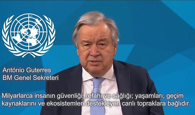 (ANKARA) - BM Genel Sekreteri António Guterres, Dünya Çölleşme ve Kuraklıkla Mücadele Günü açıklamasında, “Birlikte, doğa ve insanlık için gelişen bir geleceğin tohumlarını ekelim” çağrısı yaptı.Birleşmiş Milletler (BM) Genel Sekreteri António Guterres, Dünya Çölleşme ve Kuraklıkla Mücadele Günü nedeniyle açıklama yaptı. Kamera karşısına geçen Guterres, video mesajında “Birlikte, doğa ve insanlık için gelişen bir geleceğin tohumlarını ekelim” çağrısı yaptı.Genel Sekreter, milyarlarca insanın güvenliği, refahı ve sağlığının ekosistemleri destekleyen canlı topraklara bağlı olduğunu vurgulayarak, “Ancak bizi ayakta tutan toprağı tahrip ediyoruz. Her saniye, yaklaşık dört futbol sahası büyüklüğünde sağlıklı arazi bozuluyor” dedi.Bu yılki Çölleşme ve Kuraklıkla Mücadele Gününün temasının “Toprak için Birlik” olduğunu hatırlatan Guterres, şöyle devam etti:“Hükümetler, işletmeler, akademisyenler, topluluklar ve daha fazlası bir araya gelmeli ve harekete geçmelidir. Ne yapmamız gerektiğini biliyoruz: Birleşmiş Milletler Çölleşme ile Mücadele Sözleşmesi'nde açıkça belirtiliyor. Sözleşmenin 30. yıl dönümünü kutlarken, dünya uygulama hızını önemli ölçüde artırmalıdır.”