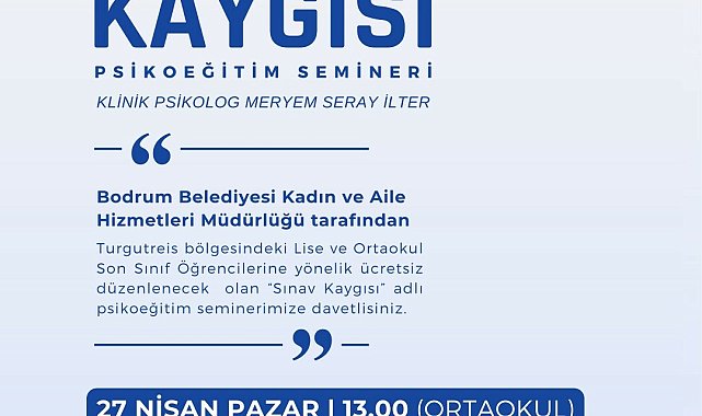 (MUĞLA) - Bodrum Belediyesi tarafından ortaokul ve lise son sınıf öğrencilerine yönelik 'Sınav Kaygısı' konulu psikoeğitim seminerleri düzenleniyor.Bodrum Belediyesi tarafından ortaokul ve lise son sınıf öğrencileri için sınav öncesi, klinik psikolog sunumuyla “Sınav Kaygısı” konulu seminerler düzenlenecek. Bodrum İlçe Milli Eğitim Müdürlüğü'nün destekleriyle Bahçelievler Mahalle Muhtarı Fatma Akalan ve Turgutreis Mahalle Muhtarı Hasan Gökhan Satılmış’ın talebi doğrultusunda seminerler, Turgutreis bölgesinde eğitim gören son sınıf öğrencilerine yönelik yapılacak.Bodrum Belediyesi Kadın ve Aile Hizmetleri Müdürlüğü tarafından organize edilen 'Sınav Kaygısı' konulu seminer, müdürlükte görevli klinik psikolog Meryem Seray İlter tarafından Bodrum Belediyesi Şevket Sabancı Kültür ve Sanat Merkezi'nde 27 Nisan 2025 Pazar günü saat 13.00’te ortaokul son sınıf öğrencilerine, 04 Mayıs 2025 Pazar günü saat 13.00’te ise lise son sınıf öğrencilerine verilecek.Bodrum Belediye Başkanı Tamer Mandalinci, seminerlerle ilgili yaptığı açıklamada şunları söyledi:“Gençlerimizin eğitim hayatında önemli bir yere sahip olan sınav dönemlerinde artan kaygılarını en aza indirebilmek hedefiyle seminerler düzenliyoruz. Onların bu yolculukta özgüvenli adımlar atmalarını sağlamak en büyük hedefimiz. Bu nedenle Bodrum Belediyesi olarak ortaokul ve lise son sınıf öğrencilerimize yönelik ‘Sınav Kaygısı’ konulu bir psikoeğitim seminerini Turgutreis’ten başlatıyoruz. Sınava hazırlanan öğrencilerin bu süreçte yanlarında olmak ve özgüvenlerinin yüksek olmasını sağlamak için elimizden geleni yapacağız. Eğitimde fırsat eşitliğini önceleyen bakış açımızla Bodrum Belediyesi olarak tüm öğrencilerin her zaman yanında olmaya devam edeceğiz.”