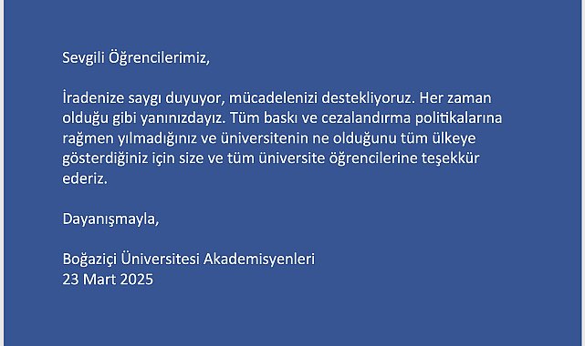 (İSTANBUL) - Günlerdir kampüslerde ve meydanlarda İstanbul Büyükşehir Belediye (İBB) Başkanı Ekrem İmamoğlu'nun da aralarında bulunduğu gözaltılara tepki gösteren üniversite öğrencilerine Boğaziçi Üniversitesi akademisyenlerinden destek açıklaması geldi. Açıklamada, "Sevgili öğrencilerimiz, iradenize saygı duyuyor, mücadelenizi destekliyoruz" denildi.Boğaziçi Üniversitesinden akademisyenlerin, İBB Başkanı İmamoğlu'nun da aralarında bulunduğu pek çok ismin gözaltına alınması üzerine eylemlere başlayan öğrencilere yönelik açıklaması şöyle:"Sevgili öğrencilerimiz, iradenize saygı duyuyor, mücadelenizi destekliyoruz. Her zaman olduğu gibi yanınızdayız. Tüm baskı ve cezalandırma politikalarına rağmen yılmadığınız ve üniversitenin ne olduğunu tüm ülkeye gösterdiğiniz için size ve tüm üniversite öğrencilerine teşekkür ederiz. Dayanışmayla"