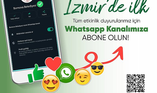 Gelişen teknolojiyi her alanda kullanmayı amaçlalayan Bornova Belediyesi, İzmir’de bir ilki daha başlattı. En güncel bilgi, duyuru ve çalışmalardan Bornovalıları haberdar etmek amacıyla WhatsApp Kanalını hayata geçirdi. WhatsApp kanalına abone olan vatandaşlar Bornova Belediyesi’nin Instagram, Twitter, Facebook gibi sosyal medya platformlarında paylaşılan gönderilere anında ulaşabilecek ve yakından takip etme fırsatı elde edecek. Kanala abone olmak için 'https://whatsapp.com/channel/0029VaIqqLEAO7RELSFOeQ0x' linkine tıklanması ya da bilboard ve clp’lerde yer alan KAREKOD uygulamasının okutulması gerekiyor.