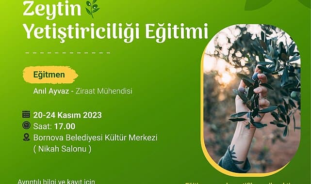 Bornova Belediyesi ve Bornova İlçe Tarım ve Orman Müdürlüğü ortaklığında, Bornova Halk Eğitimi Merkezi koordinesinde gerçekleşecek Zeytin Yetiştiriciliği Eğitimi Bornova Belediyesi Kültür Merkezi’nde yapılacak. Toplamda 48 saat sürecek eğitimlerde Bornova Belediyesi Ziraat Mühendisi Anıl Ayvaz tarafından verilecek.