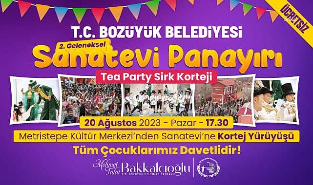 Bozüyük Belediyesi Sanatevi Yaz Atölyeleri, ‘2. Geleneksel Sanatevi Panayırı’ ile sona erecek, ilçeli çocuklar panayırda buluşacak. Sanatevi Yaz Atölyeleri, 20 Ağustos 2023 Pazar günü 2. Geleneksel Sanatevi Panayırı ile sona erecek. Dok Sirk Kumpanyası’nın gösterileri ile renklenecek panayır, saat 17.30’da Metristepe Kültür Merkezi’nden Sanatevi’ne yapılacak kortej yürüyüşü ile başlayacak. Sanatevi’nin önünde devam edecek programda kukla gösterisi ile ‘Doğa İçin Tasarla’ defilesi yer alırken programın kapanışı yine Dok Sirk Kumpanyası’nın eğlenceli gösterileriyle yapılacak. Panayırda yaz atölyelerine katılan öğrencilerin yaptıkları ürünlerin yer aldığı serginin açılışı da yapılacak.