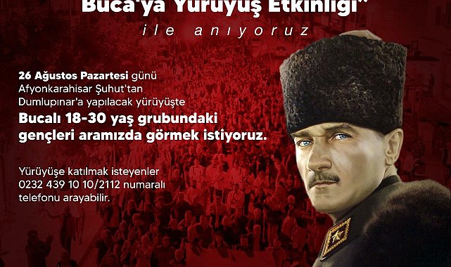 (İZMİR) - 26 Ağustos Pazartesi günü Afyonkarahisar Şuhut’tan Dumlupınar’a kadar devam eden güzergâhta “Gazi Paşa’nın Ayak İzlerinden Buca’ya Yürüyüş Etkinliği” düzenleyeceklerini açıklayan Buca Belediye Başkanı Görkem Duman, “Bu tarihi anı tekrar yaşamak ve atalarımızı anmak için Bucalı gençleri aramızda görmek istiyoruz” dedi.Buca Belediye Başkanı Görkem Duman, 30 Ağustos Zaferi ile sonuçlanan Büyük Taaruz’un 102. yıl dönümünde Afyonkarahisar’daki tarihi yürüyüşe Bucalı gençlerle katılarak, Büyük Zafer’i anacaklarını açıkladı.Başkan Duman, 26 Ağustos 1922’de günün ilk ışıklarıyla başlayan Büyük Taarruz’un, 30 Ağustos günü Başkomutanlık Meydan Muharebesi’nde kazanılan Büyük Zafer'le sonuçlandığını dile getirerek, şunları kaydetti:“Başkomutan Gazi Mustafa Kemal Atatürk’ün dehasını gösteren ve Türklerin özgürlüğe adımı olan bu zaferin 102. yılında Afyonkarahisar’da ‘Gazi Paşa'nın Ayak İzlerinden Buca'ya Yürüyüş Etkinliği’ ile tarihimizi tekrar yaşıyor, atalarımızı anıyoruz. 26 Ağustos Pazartesi günü Afyonkarahisar Şuhut'tan Dumlupınar'a yapılacak bu anlamlı yürüyüşte Bucalı gençleri de yanımızda görmek istiyoruz. Yürüyüşe 102 gencimiz ile katılmayı hedefliyoruz. Bilgi almak isteyenler, bize 0232 439 10 10 (2112) numaralı telefondan ulaşabilirler.”