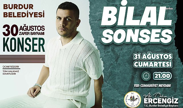 (BURDUR)- Burdur Belediyesi’nin katkılarıyla 30 Ağustos Zafer Bayramı kutlamaları kapsamında Bilal Sonses sahne alacak.Belediye Başkanı Orkul Ali Cengiz, "Başta Ulu Önderimiz Gazi Mustafa Kemal Atatürk, silah arkadaşlarının ve atalarımızın bizlere emanet ettiği bu mirasa her zaman sahip çıkacağız. Büyük Zafer’in 102'inci yılı etkinlikleri kapsamında ülkemizin sevilen sanatçı Bilal Sonses sahne alacak. Tüm hemşehrilerimizi bekliyorum" dedi.Burdur Belediyesi, 30 Ağustos Zafer Bayramı kutlamaları kapsamında düzenlenen etkinliklere destek veriyor. Bu kapsamda Bilal Sonses, şarkılarını vatandaşlar için seslendirecek. Belediye Başkanı Ali Orkun Ercengiz, “30 Ağustos sadece bizim için değil tüm dünya için önemli bir gündür. Başta Ulu Önderimiz Gazi Mustafa Kemal Atatürk, silah arkadaşlarının ve atalarımızın bizlere emanet ettiği bu mirasa her zaman sahip çıkacağız. Büyük Zafer’in 102'inci yılı etkinlikleri kapsamında ülkemizin sevilen sanatçı Bilal Sonses sahne alacak. Tüm hemşehrilerimizi 31 Ağustos Cumartesi akşamı saat 21.00’de Cumhuriyet Meydanı’nda gerçekleşecek konserimize davet ediyorum” diye konuştu.