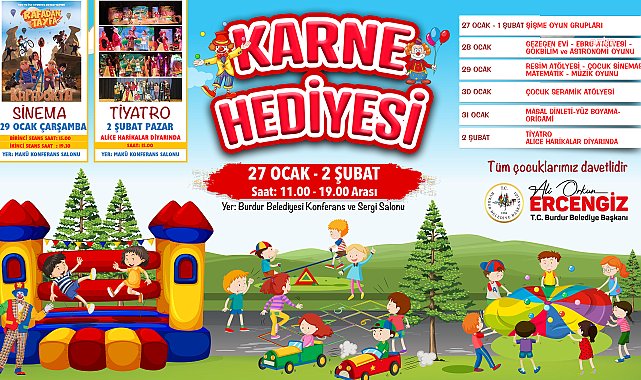 (BURDUR)- Burdur Belediyesi, yarıyıl tatili dolayısıyla çocuklara özel bir dizi etkinlikten oluşan karne hediyesi programı hazırladı.Burdur Belediyesi tarafından düzenlenen geleneksel karne hediyesi programı, bu yıl da Burdur Belediyesi Konferans ve Sergi Salonu’nda gerçekleştiriliyor. 27 Ocak-1 Şubat günleri arasında düzenlenecek etkinlikler saat 11.00’de başlayıp 19.00’a kadar devam edecek.27 Ocak-1 Şubat arasında şişme oyun grupları çocuklarla buluşacak. Çocuklar, 1 hafta boyunca ebru, resim ve seramik atölyelerinden masal dinletisine ve tiyatro gösterilerine kadar pek çok etkinlikle tatilin tadını çıkaracak.