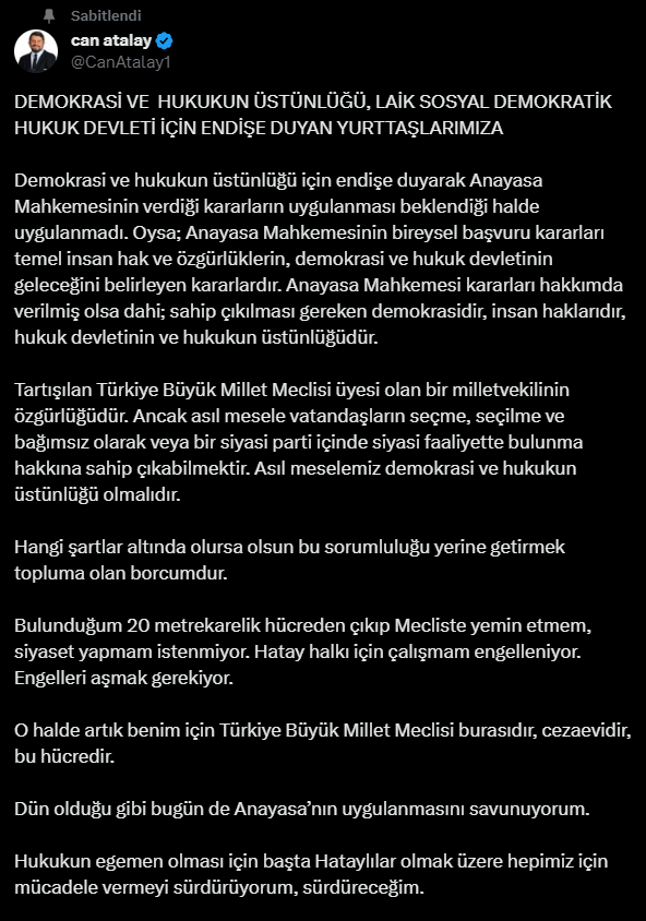 Türkiye İşçi Partisi (TİP) Hatay Milletvekili Can Atalay, "Bulunduğum 20 metrekarelik hücreden çıkıp Mecliste yemin etmem, siyaset yapmam istenmiyor. Hatay halkı için çalışmam engelleniyor. Engelleri aşmak gerekiyor. O halde artık benim için Türkiye Büyük Millet Meclisi burasıdır, cezaevidir, bu hücredir. Dün olduğu gibi bugün de Anayasa’nın uygulanmasını savunuyorum. Hukukun egemen olması için başta Hataylılar olmak üzere hepimiz için mücadele vermeyi sürdürüyorum, sürdüreceğim" açıklamasını yaptı.Gezi Davası kapsamında halen Silivri’deki Marmara Cezaevi'nde bulunan TİP Hatay Milletvekili Can Atalay, Anayasa Mahkemesi'nin kendisi hakkında verdiği hak ihlali kararını Yargıtay 3. Ceza Dairesi'nin uygulamamasına tepki gösterdi. Atalay'ın mesajı, avukatları tarafından yönetilen kişisel X hesabından bu akşam yayınlandı. Mesaj şöyle:"TARTIŞILAN TÜRKİYE BÜYÜK MİLLET MECLİSİ ÜYESİ OLAN BİR MİLLETVEKİLİNİN ÖZGÜRLÜĞÜDÜR""Demokrasi ve hukukun üstünlüğü için endişe duyarak Anayasa Mahkemesinin verdiği kararların uygulanması beklendiği halde uygulanmadı. Oysa; Anayasa Mahkemesinin bireysel başvuru kararları temel insan hak ve özgürlüklerin, demokrasi ve hukuk devletinin geleceğini belirleyen kararlardır. Anayasa Mahkemesi kararları hakkımda verilmiş olsa dahi; sahip çıkılması gereken demokrasidir, insan haklarıdır, hukuk devletinin ve hukukun üstünlüğüdür. Tartışılan Türkiye Büyük Millet Meclisi üyesi olan bir milletvekilinin özgürlüğüdür. Ancak asıl mesele vatandaşların seçme, seçilme ve bağımsız olarak veya bir siyasi parti içinde siyasi faaliyette bulunma hakkına sahip çıkabilmektir. Asıl meselemiz demokrasi ve hukukun üstünlüğü olmalıdır. Hangi şartlar altında olursa olsun bu sorumluluğu yerine getirmek topluma olan borcumdur.Bulunduğum 20 metrekarelik hücreden çıkıp Mecliste yemin etmem, siyaset yapmam istenmiyor. Hatay halkı için çalışmam engelleniyor. Engelleri aşmak gerekiyor. O halde artık benim için Türkiye Büyük Millet Meclisi burasıdır, cezaevidir, bu hücredir. Dün olduğu gibi bugün de Anayasa’nın uygulanmasını savunuyorum. Hukukun egemen olması için başta Hataylılar olmak üzere hepimiz için mücadele vermeyi sürdürüyorum, sürdüreceğim. Yolumuza devam ederken Hatay’da yitirdiklerimizin davasını üstleneceğimizi, 6 Şubat depremleri ile yerle bir olan Hatayı hep birlikte ayağa kaldırmak için canla başla çalışacağımızı, insan canını imar rantı içerisinde bir maliyet kalemi olarak görenlere ve insanımızı bu yıkıma mahkûm eden anlayışa karşı mücadele edeceğimizi söylemiştik."MÜCADELE VE DAYANIŞMAYI SÜRDÜRMEYE DEVAM ETMENİN ZAMANIDIR"Keyfiliğin sonucunun otoriterliktir. 100 yılını arkada bırakan Cumhuriyetimiz, ancak demokratik hukuk devletinin kurallarıyla daha da ileri taşınabilir. Sözümüz, sözdür. Yolumuzdan dönmeyeceğiz. Karşı karşıya olduğumuz tehlikelerin farkındayız. Yöneticilerin keyfiliğine, hukuksuzluğuna karşı çıkan bütün yurttaşlarımızı, yan yana duruşumuz ve dayanışmamız kurtaracaktır. Bu nedenle; hangi mahkeme kararının ne zaman ve ne şekilde uygulanacağını, uygulanıp uygulanmayacağını bir kenara bırakmanın vaktidir. Mücadele ve dayanışmayı sürdürmeye devam etmenin zamanıdır. Bir kez daha söylüyorum: mevcut durum ve önüme çıkarılabilecek hiçbir engel, beni Hatay halkına karşı olan sorumluluğumu yerine getirmekten alıkoyamayacaktır."