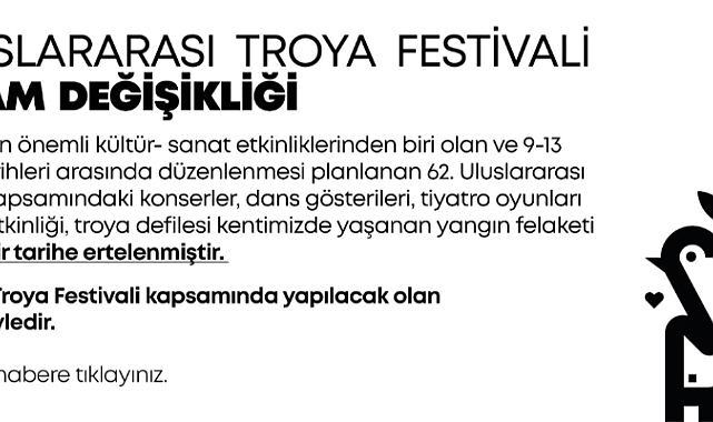 (ÇANAKKALE)- Çanakkale’nin köklü kültür-sanat organizasyonlarından biri olan ve bu yıl 9-13 Ağustos 2025 tarihleri arasında gerçekleştirilmesi planlanan 62. Uluslararası Troya Festivali kapsamındaki birçok etkinlik, kentte yaşanan yangın felaketi nedeniyle ileri bir tarihe ertelendi.