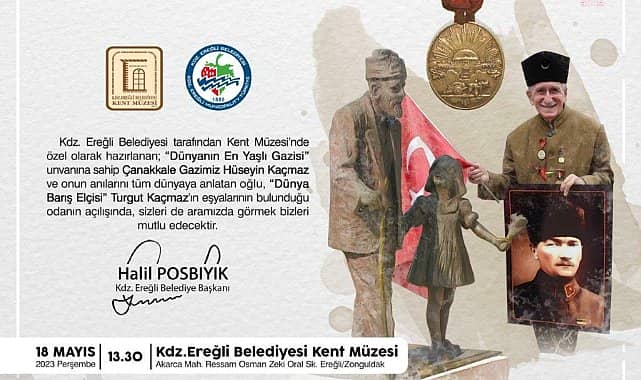 Kdz. Ereğli Belediyesi, Belediye Kent Müzesi’nde ‘Dünyanın En Yaşlı Gazisi’ unvanına sahip Çanakkale Gazisi Hüseyin Kaçmaz’ın özel eşyalarının bulunduğu özel bir oda açacaklarını duyurdu. Kdz. Ereğli Belediyesi Kent Müzesi’nde Çanakkale Gazisi Hüseyin Kaçmaz ve onun anılarını tüm dünyaya anlatan oğlu ‘Dünya Barış Elçisi’ Turgut Kaçmaz’ın özel eşyalarının bulunduğu özel bir oda açılıyor. Kdz. Belediye Başkanı Halil Posbıyık, 18 Mayıs Perşembe günü saat 13.30’da düzenlenecek açılışa tüm Ereğli halkını davet etti.
